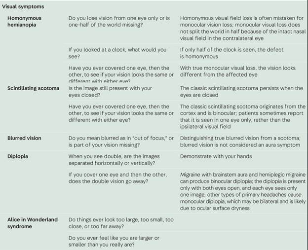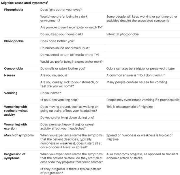 Questions such as “How do you feel after the pain is over?” and “How long does it take to feel ‘back to normal’?” allude to the postdrome, which is a common feature of migraine, otherwise known as the migraine “hangover.” There may be mild residual pain, fatigue, cognitive dysfunction (“brain fog”), hunger, gastrointestinal symptoms, sensory sensitivity, or vertigo lasting up to 1 to 2 days. Note that this is part of the migraine attack and should be considered when determining the number of migraine days in a given period. Effects or side effects of acute medications may cause similar symptoms, making it difficult to distinguish the etiology in some patients; however, postdrome symptoms are most frequently incorrectly attributed to medications. For patients who are rarely or never headache free, it is important to ask how long it takes to return to their baseline state.