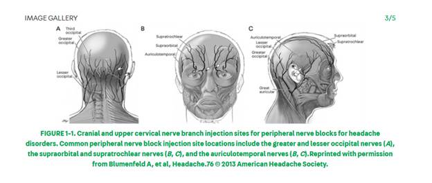- Tenderpoints: Palpation of cranial peripheral sensory nerves for tenderness or pain reproduction including the greater and lesser occipital nerves, auriculotemporal nerves, supraorbital and supratrochlear nerves, zygomaticotemporal nerves, and the trochleae.
