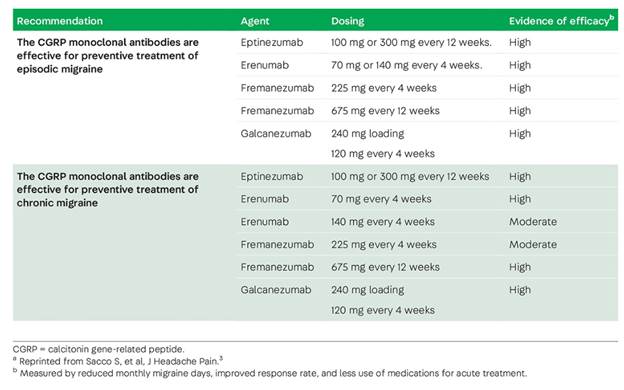 The CGRP monoclonal antibodies and the gepants are generally well tolerated. In clinical trials, the most commonly reported adverse events with the CGRP monoclonal antibodies are constipation and injection site reactions.The safety of CGRP monoclonal antibodies in pregnancy and lactation has not been demonstrated and these drugs should likely be avoided in these settings. The European Headache Federation recommends caution in patients who have vascular disease or risk factors and Raynaud phenomenon.The guideline also recommended that erenumab be used with caution in patients with a history of severe constipation.