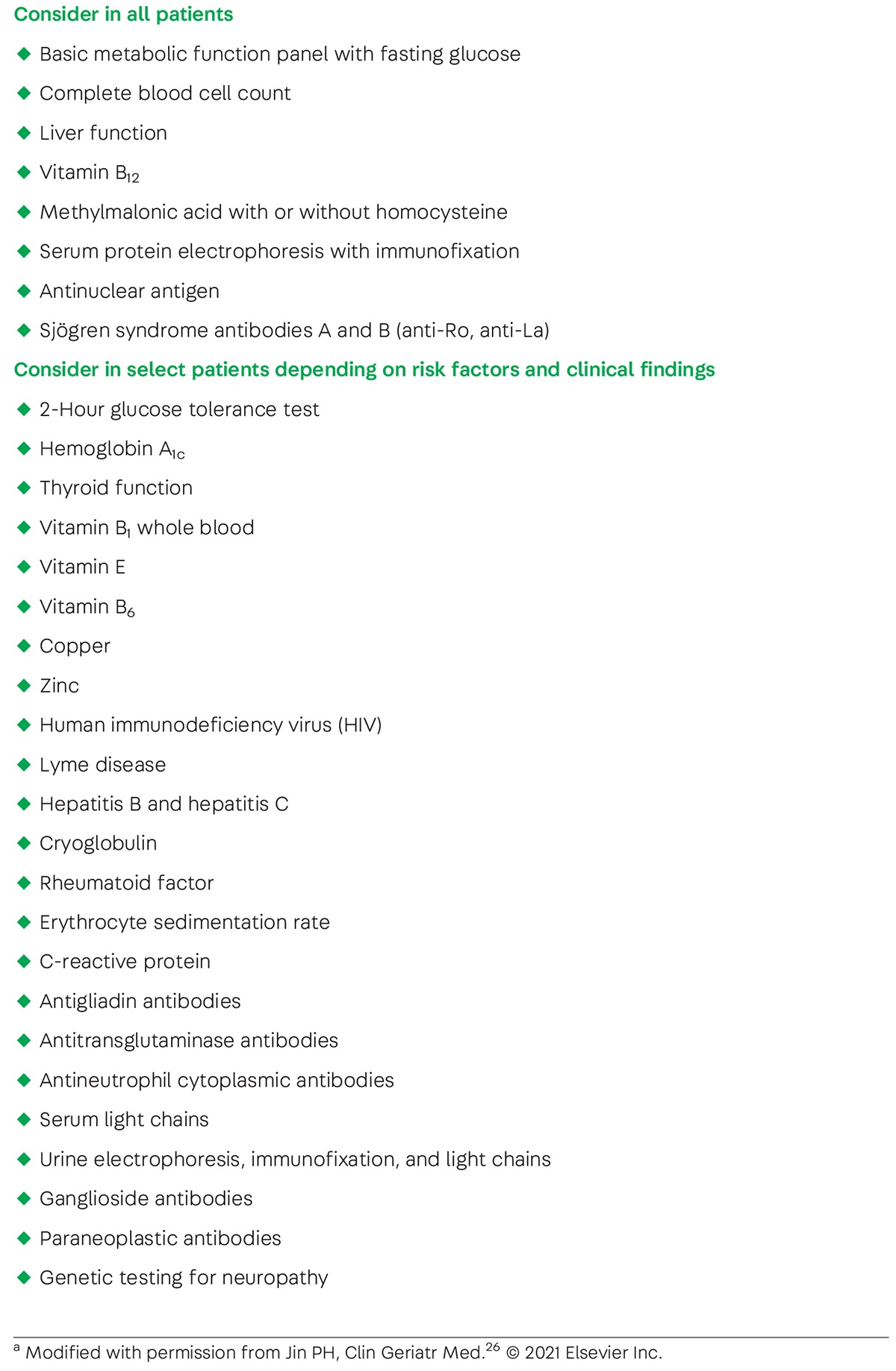 Skin biopsy can assist in the evaluation of small fiber neuropathy. Testing is typically pursued in select clinical contexts if evaluation for a polyneuropathy via electrodiagnostic studies is normal. Testing involves a 3-mm punch biopsy of a single limb (generally lower extremity) at sites of interest including the distal leg, distal thigh, and proximal thigh. Biopsy samples are assessed for intraepidermal nerve fiber density, which is expected to be reduced in small fiber neuropathies. The pattern of density loss can also speak to the distal (length-dependent) or multifocal (non–length-dependent) nature of the neuropathy. In addition to intraepidermal nerve fiber density, biopsy samples can be stained to assess for the presence of amyloid deposition and for sudomotor innervation of sweat glands.